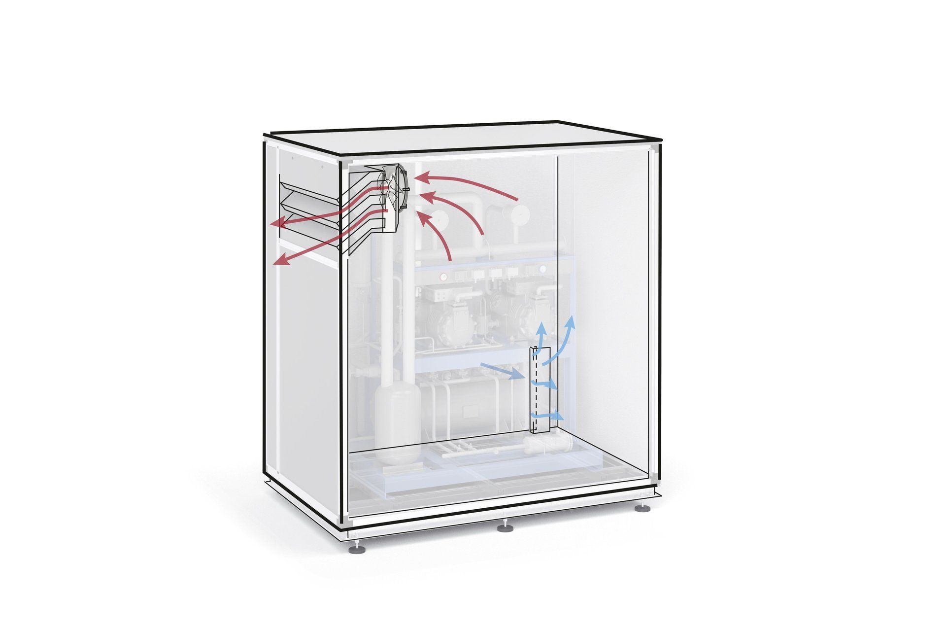 La dissipation de la chaleur émise par le compresseur se fait avec un ventilateur fonctionnant très silencieusement avec un volume d‘air contrôlé automatiquement de 0 à 2000 m³/h en fonction de la température intérieure, y compris le contrôle de la température via un thermostat (0-10V). L’admission d’air frais passe de à l‘arrière du boîtier via un système à labyrinthe et l’évacuation de l‘air via un ensemble spécial de lamelles insonorisantes pour un écoulement transversal optimal traversant le système de réfrigération intégré.