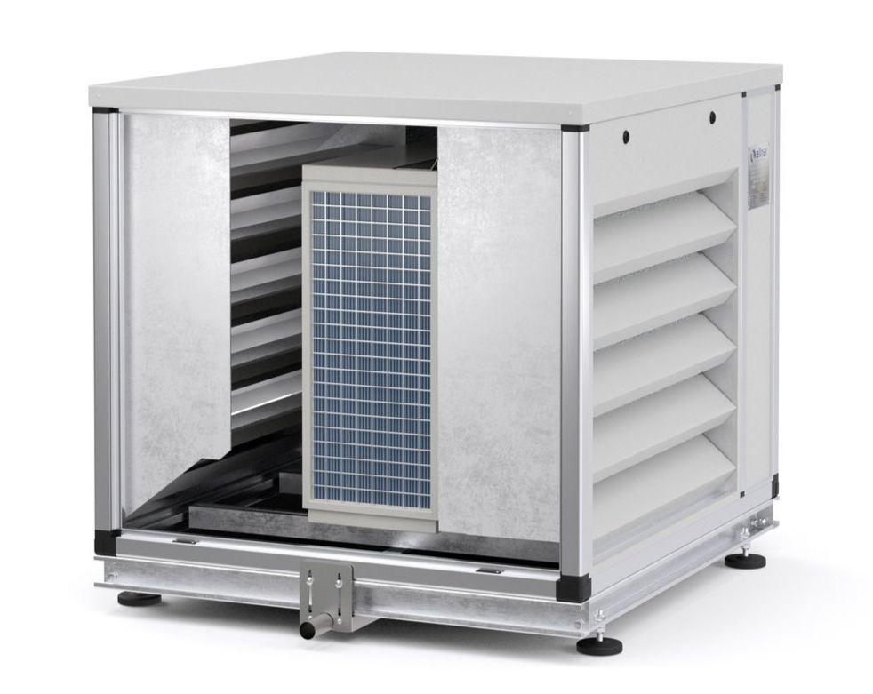 La dissipation de la chaleur émise par le compresseur se fait avec un ventilateur fonctionnant très silencieusement avec un volume d‘air contrôlé automatiquement de 0 à 2000 m³/h en fonction de la température intérieure, y compris le contrôle de la température via un thermostat (0-10V). L’admission d’air frais passe de à l‘arrière du boîtier via un système à labyrinthe et l’évacuation de l‘air via un ensemble spécial de lamelles insonorisantes pour un écoulement transversal optimal traversant le système de réfrigération intégré.