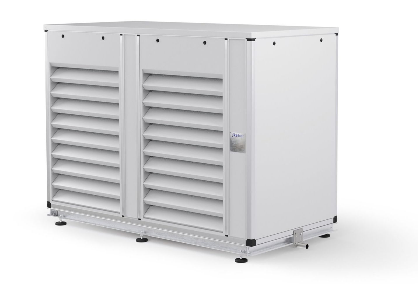 zur Abfuhr der Kompressorabwärme über einen sehr leise laufenden Stützventilator mit automatisch geregelter Luftmenge von 0 bis 2000 m³/h, inklusive Temperaturregelung über Thermostat (0-10V) je nach Innenraum-temperatur. Ansaugung auf der Gehäuse-rückseite über Labyrinthsystem und Ausblasung über schalldämpfendes Spezial Lamellenpaket – für eine optimale Querströmung über die eingebaute Kälte-Verbundanlage.