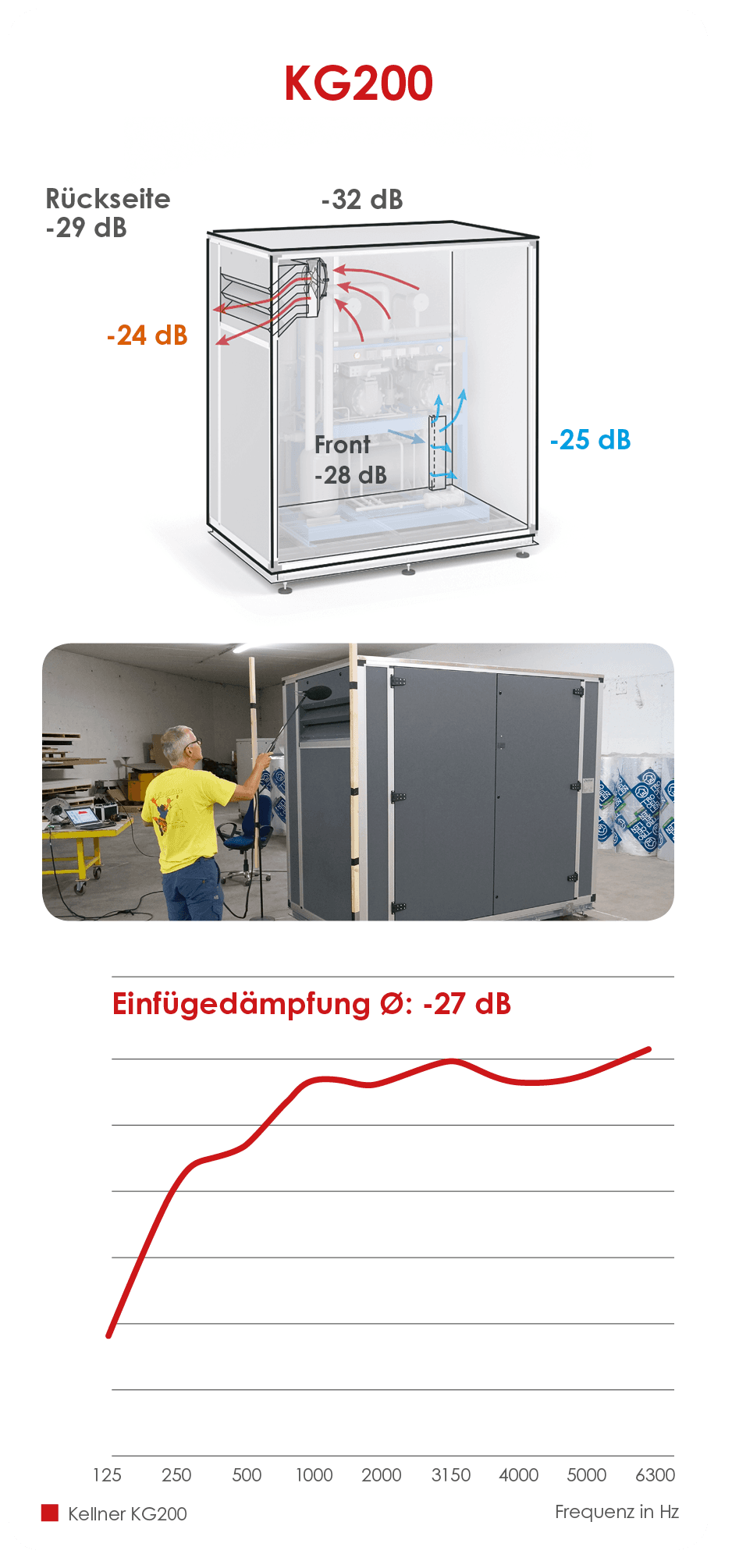 Immer höhere Anforderungen von Gemeinden, strengere Lärmvorschriften und sensible Anrainer machen eine konstruktiv und materialtechnisch hochwertige Schalldämmung zur Erfüllung der Vorgaben und zur langjährigen Erhaltung der Gerätefunktion notwendig. Die Kellner- Schalldämmgehäuse werden deshalb stetig weiterentwickelt und in sehr präzisen Schalltests mittels Hüllflächenverfahren gemessen.